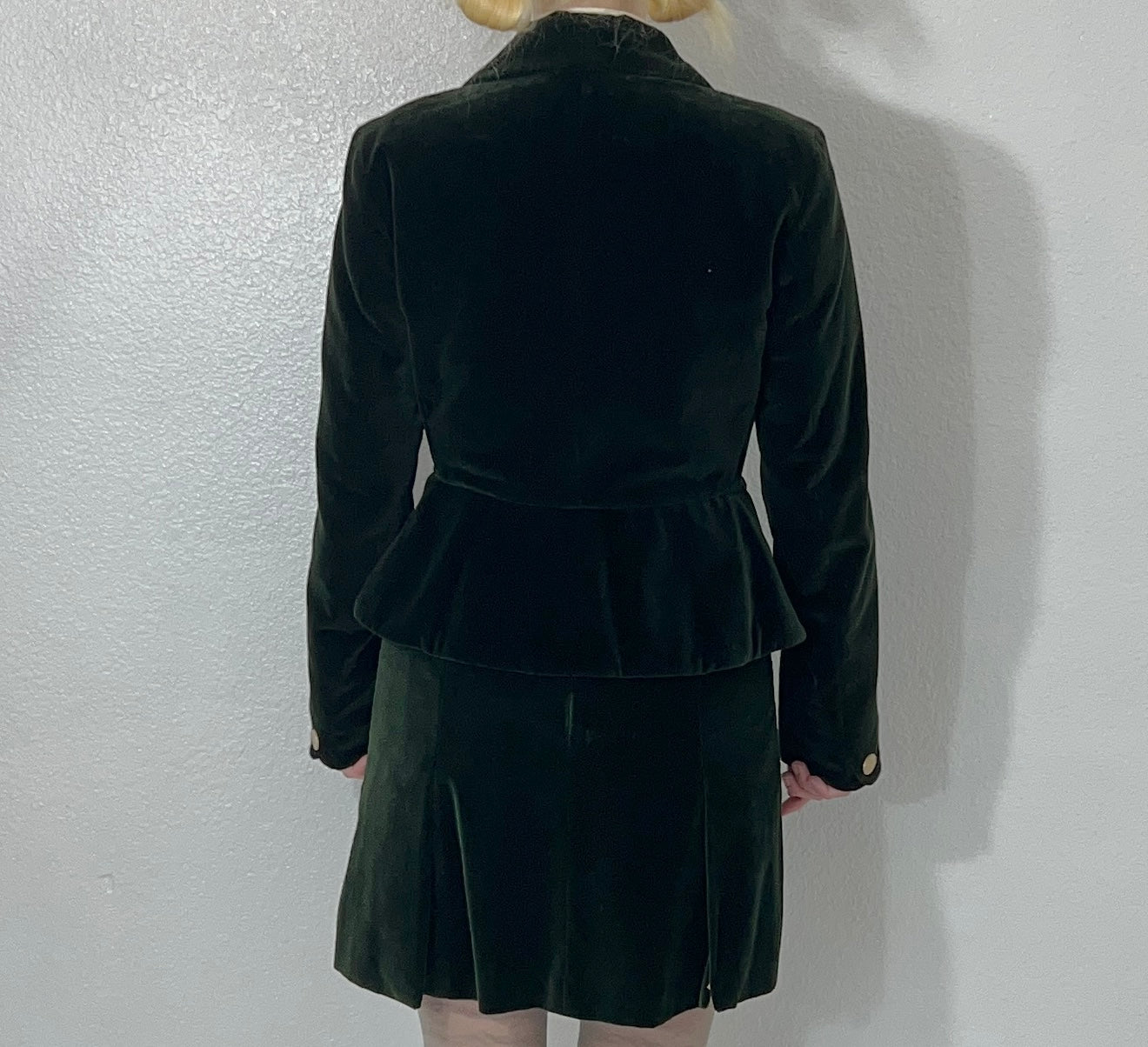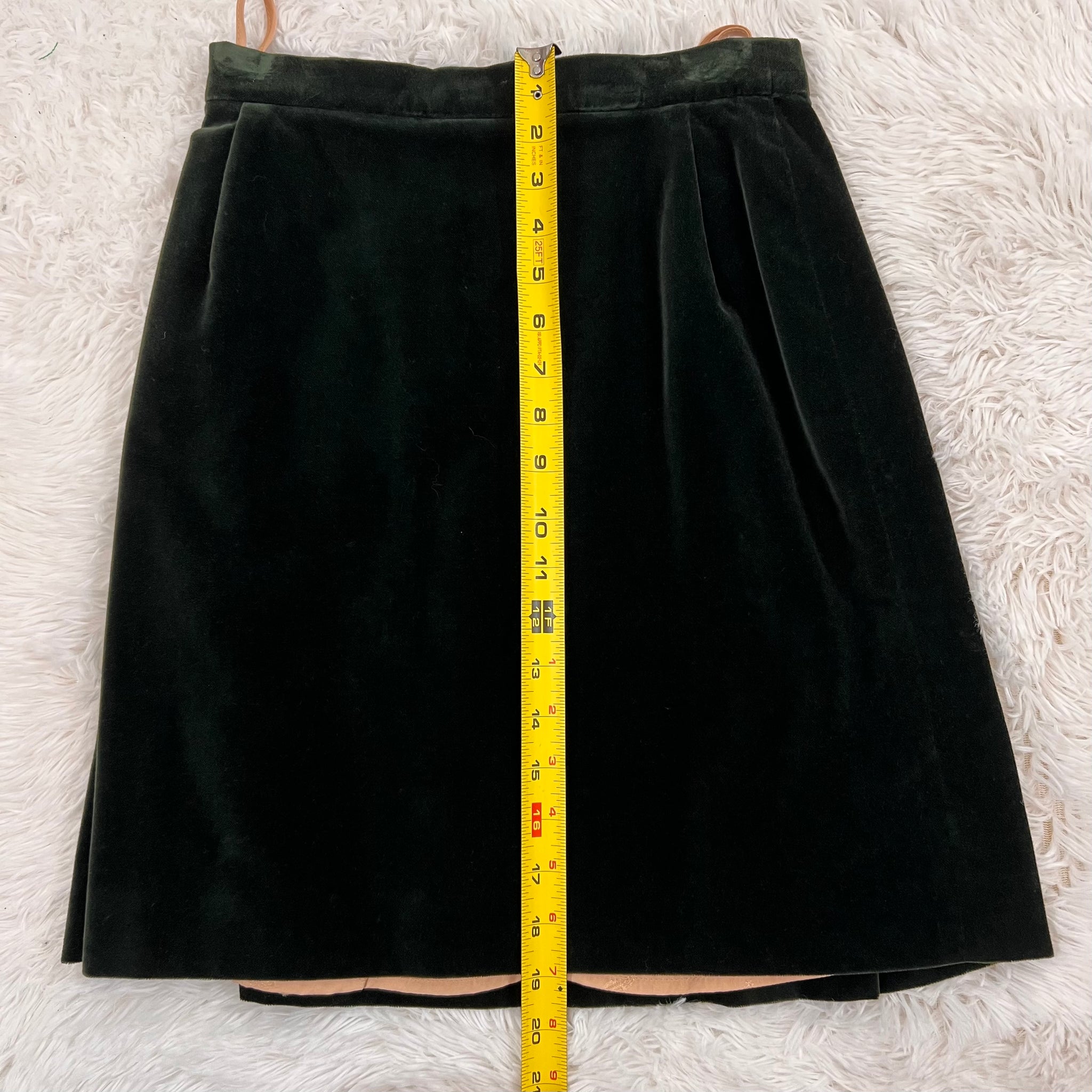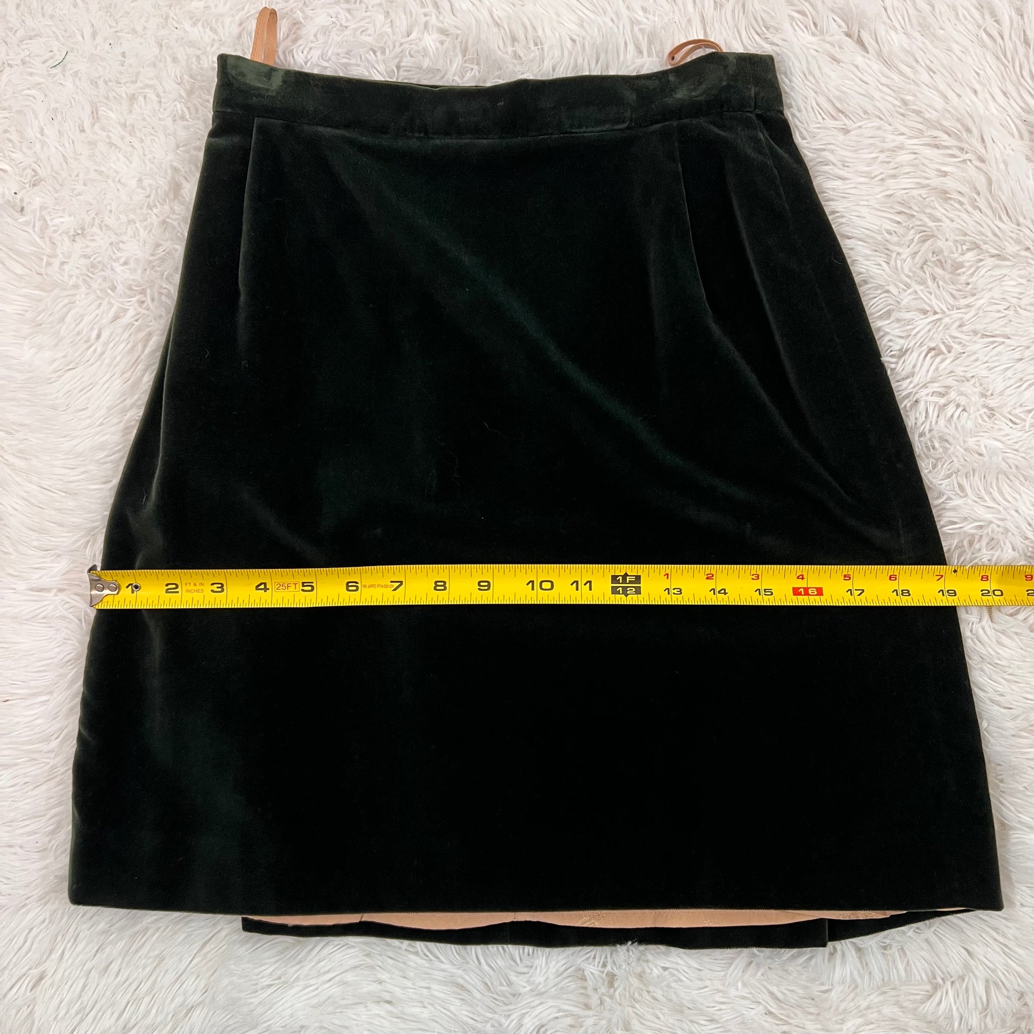 Condition: Excellent condition, original Saks Fifth Avenue tags still attached. Some hanger pressure spots in the velvet noted around the waistband of the skirt, around the shoulders, and zipper. Small stain in inner lining not visible when worn (see photo). The skirt lining needs to be re-hemmed as the fabric has stretched a little with time and can peek out beyond the velvet hemline when worn, should be an easy fixation a tailor (see photo of the skirt laying flat for example).