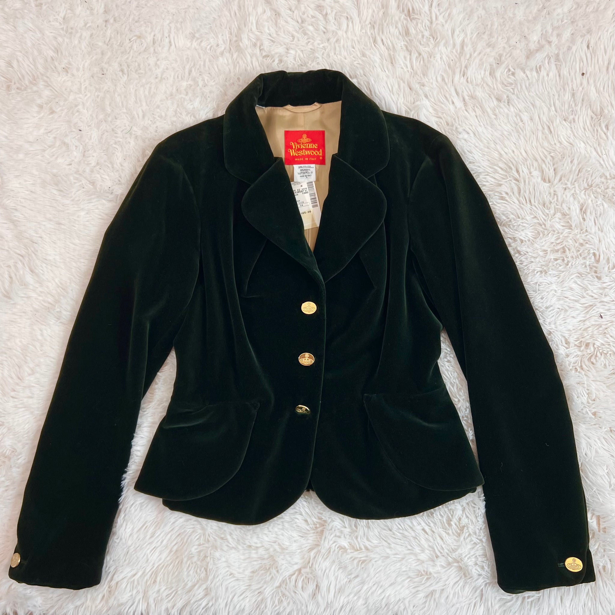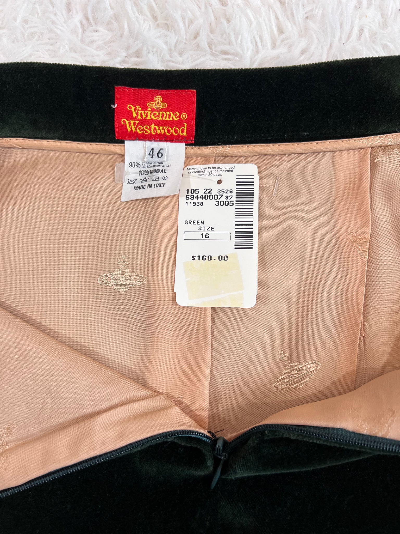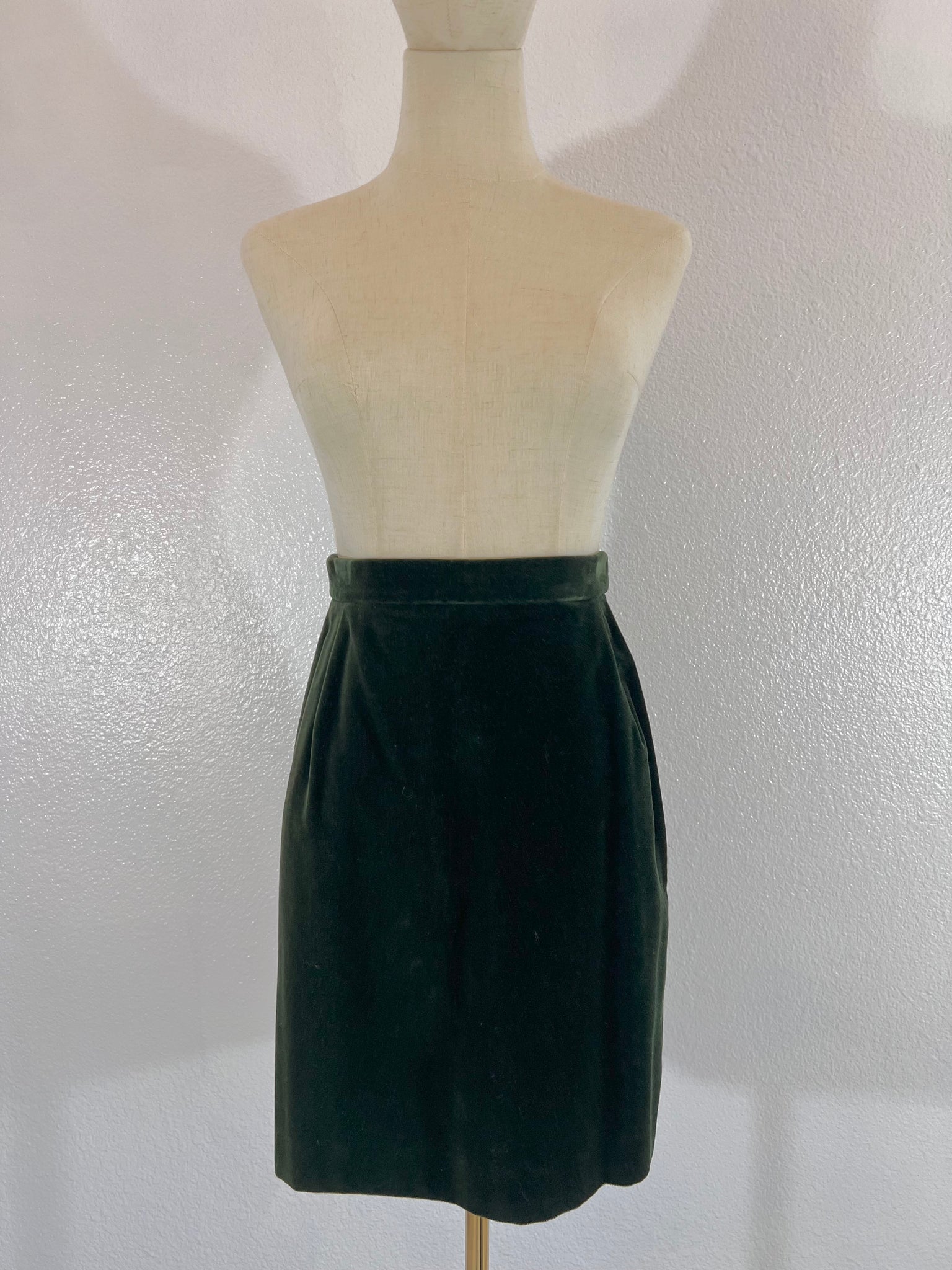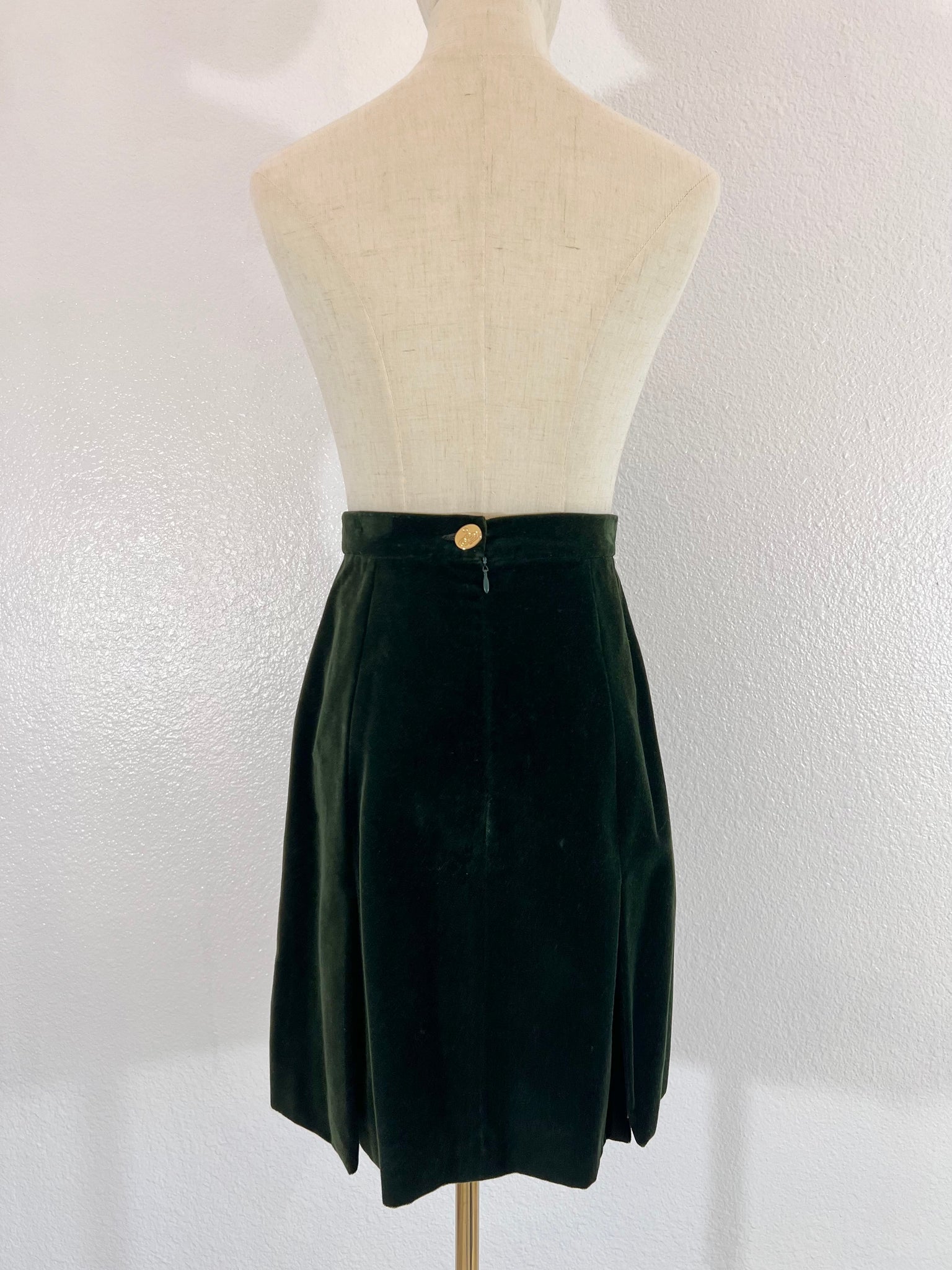 Condition: Excellent condition, original Saks Fifth Avenue tags still attached. Some hanger pressure spots in the velvet noted around the waistband of the skirt, around the shoulders, and zipper. Small stain in inner lining not visible when worn (see photo). The skirt lining needs to be re-hemmed as the fabric has stretched a little with time and can peek out beyond the velvet hemline when worn, should be an easy fixation a tailor (see photo of the skirt laying flat for example).