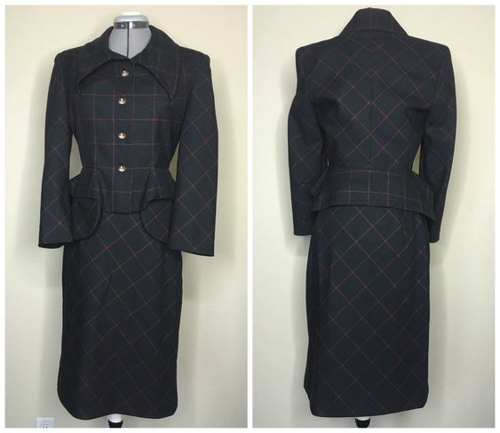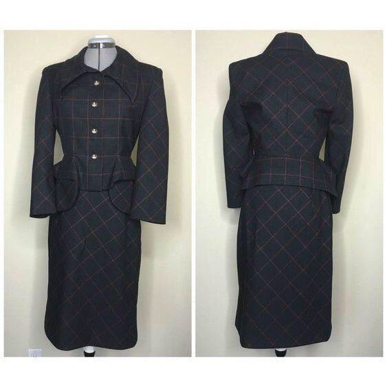 Dark Grey and Red Check Peplum Pocket Suit