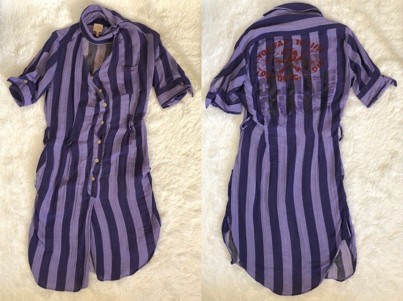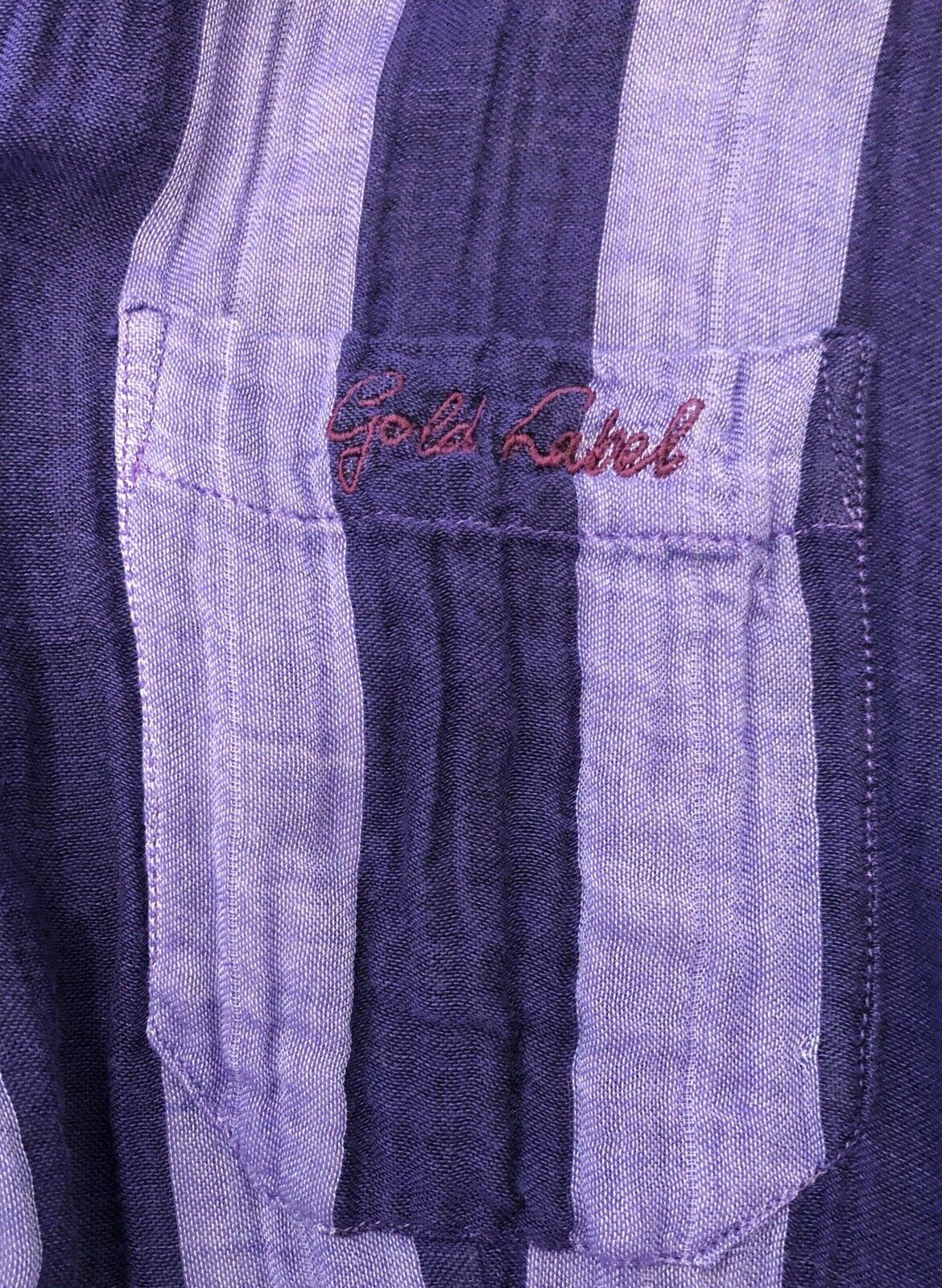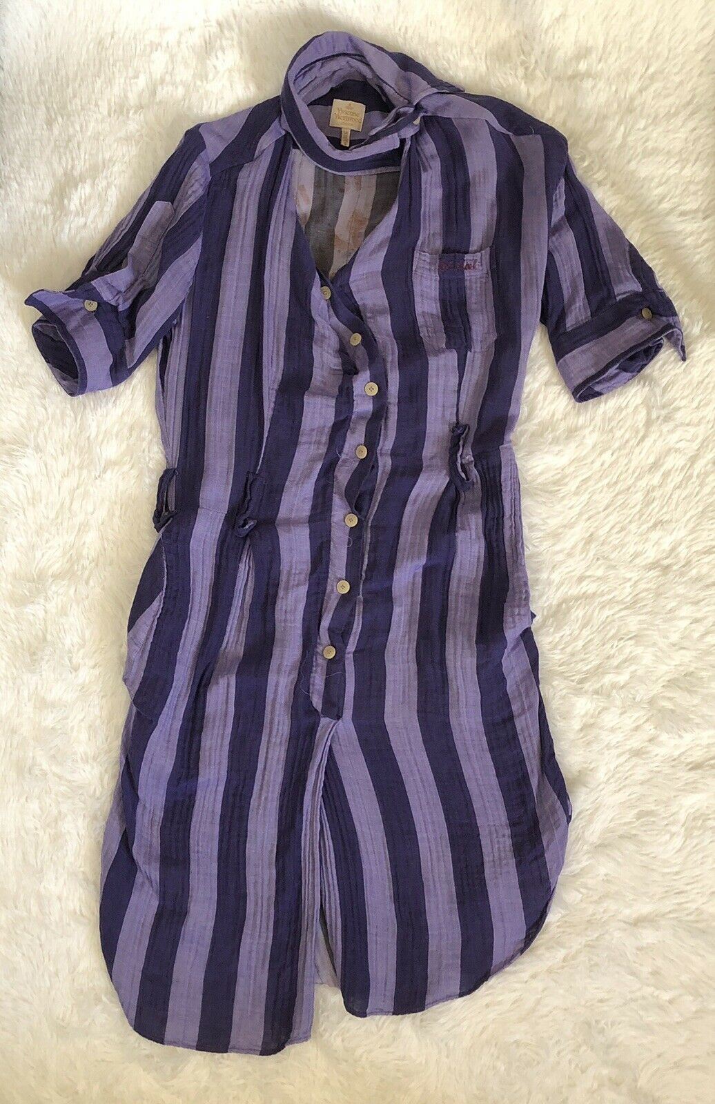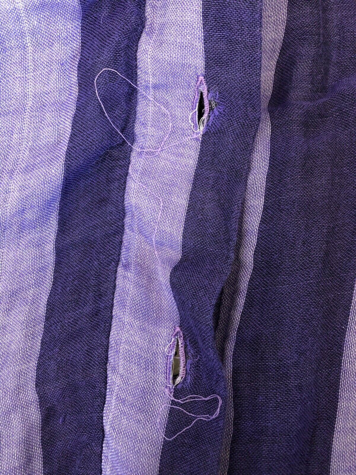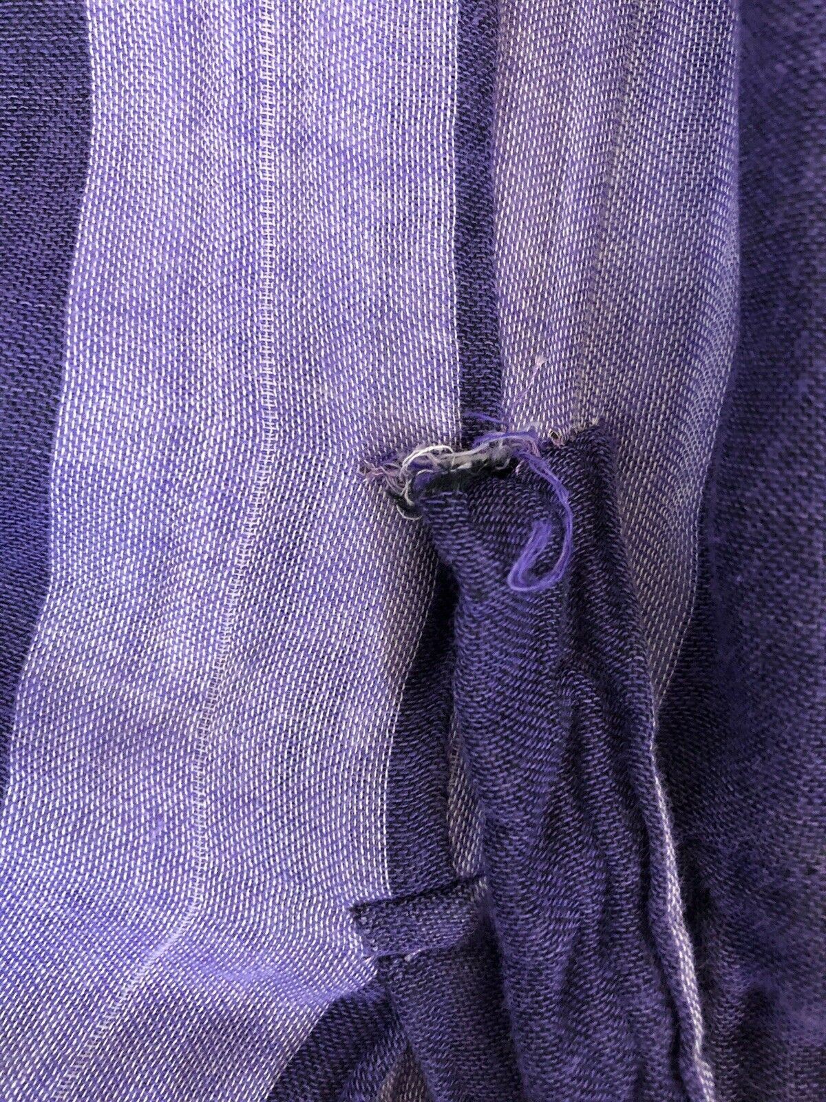 Pre-owned, a few loose/frayed button holes, one loose belt loop, small loose armpit seam, all easy repairs and no permanent damage. Wrinkled fabric is the aesthetic and is not from storage. The fabric feels like a super soft natural gauzy cotton.